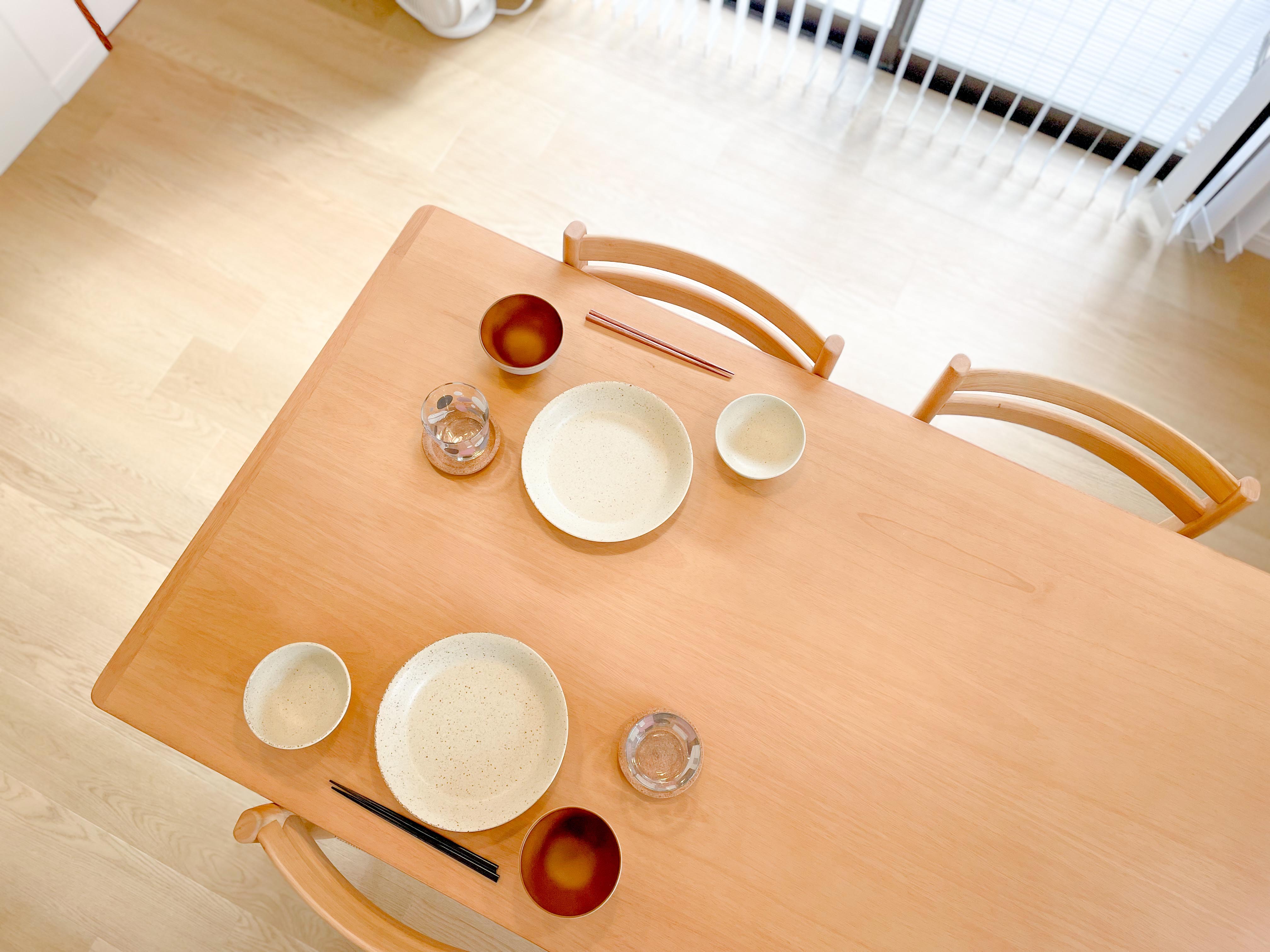 大皿、深皿、平皿、茶碗、汁椀、子供用食器、マグカップ、グラス、スプーン、フォーク、箸など、人数分揃えています。
