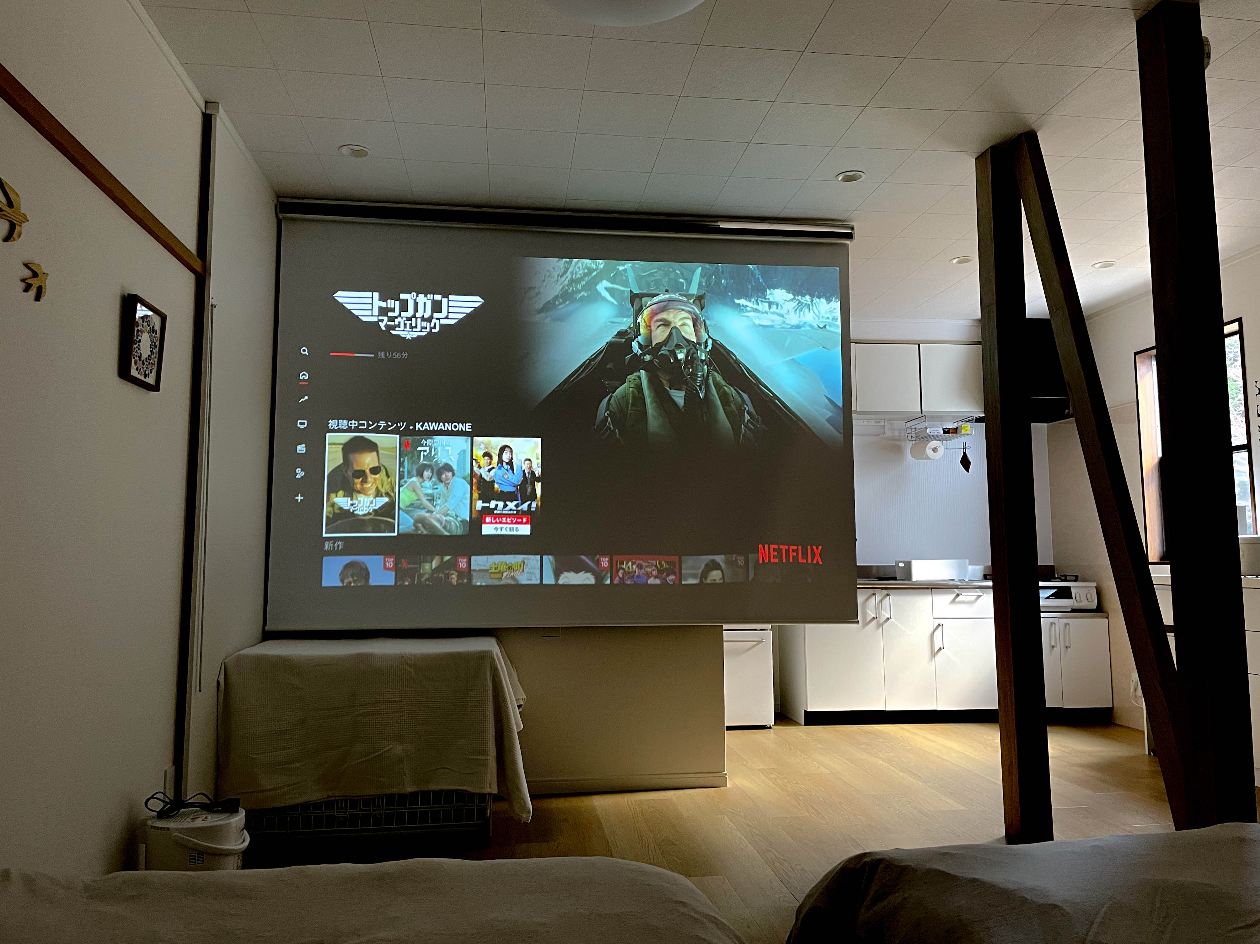 100インチスクリーンのプロジェクターを採用しました。ベッドに横になりながら大画面で動画コンテンツを視聴可能。